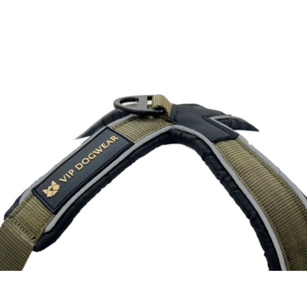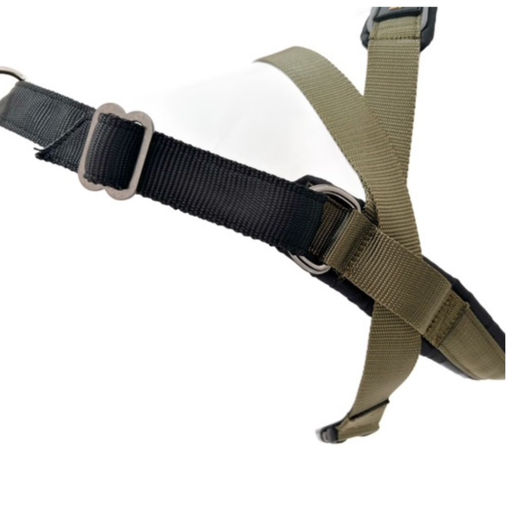Valjaissa on käytännöllinen D-rengas niskassa, jota voidaan käyttää, jos haluat kävellä koiran rinnalla voimaharjoittelun aikana tai taluttaa koiraa aktiviteettiin ja takaisin. Huomaa! että tämä ei ole vetopiste – D-renkaan kiristäminen nostaa valjaita.